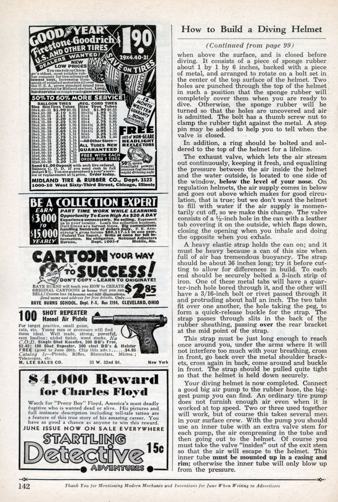 The June , 1933 edition of Modern Mechanix offered a four page spread on how to make an open circuit dive helmet. A do-it-yourself project from the good old days when people read how to make dangerous and bizarre DIY contraptions with common items found around the house. Today we just record ourselves using common items around the house to inflict unthinkable, masochistic injury and put it on YouTube or send it to Daniel Tosh…or both.