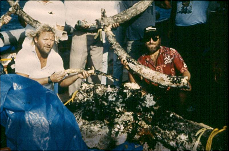 Chuck Mitchell (he is the one on the right) was early on the California diving scene through his acquaintances at Mel’s (that is Mel Fisher’s) Aqua Shop in Redondo Beach. He spent a majority of his time at La Jolla Cove diving and spear fishing. In 1964, he was the Pacific Coast Diving Champ and decided to move to Florida shortly thereafter. Despite his western origins, Capt. Chuck was not easily overlooked as a Florida Keys character. He possessed a style all his own and always commanded a presence. It may have been the denim vest (with a flaming skull embroidered on the back) and shorts; always in shorts! If he could not wear shorts he was “just too far north!”. Perhaps it was the bandana and the silver hair pulled into a ponytail and the gratuitous references to rum, punctuated by the prolific use of the term “AARRRRRRGHH” with his unmistakable, resonating baritone voice.Capt. Chuck was animated and colorful, opinionated and dramatic.